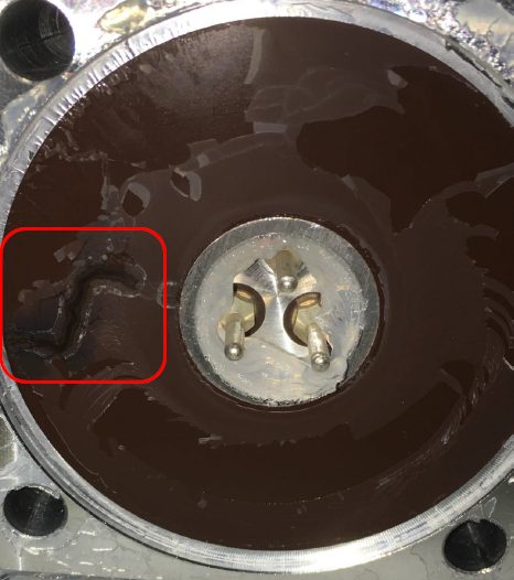 Below are two examples of arcing at the generator/HV cable connection. This arcing could be due to a defective silicone washer, dried grease, or a loose HV cable connection. Correct installation of the HV cable may help ensure system reliability and X-ray tube/generator/HV cable longevity and proper operation of the CT system.